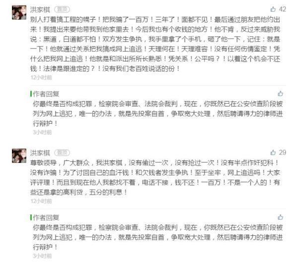 26日凌晨,“洪家棋”在“掌上恩施”公众号留言称,自己被别人以搞工程为幌子骗取100万,为了讨回血汗钱,与欠钱者发生争执,于是拿手机砸了对方一下,就变成了网上追逃犯。他自称“从没有偷过,没有抢过,没有诈骗,没有半点作奸犯科”。