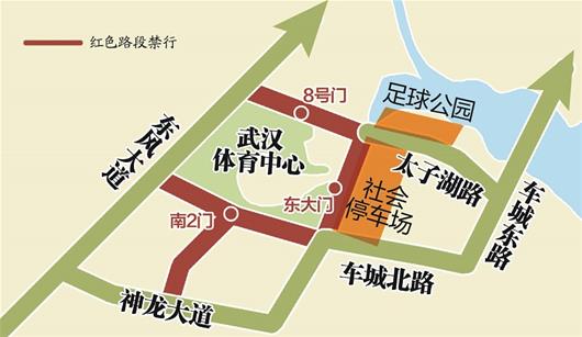 武汉交警特别提示,两个停车场泊位有3000余个,泊位严重不足,请广大市民尽量选择公共交通出行,观众可乘坐地铁3号线、6号线到东风公司站或体育中心站下车,步行5-10分钟即到武汉体育中心大门,当晚地铁将延时到晚上11点左右收班。