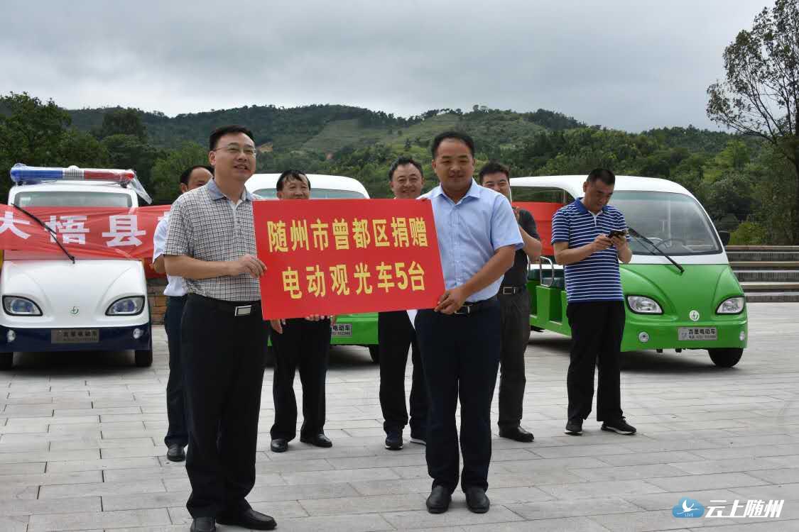 8月29日,曾都区委书记何运平,区长张健带队到大悟县,广水市考察扶贫旅游,特色小镇和美丽乡村建设,向大悟县金岭村捐赠观光车。