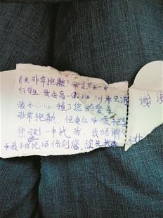 看到车子被撞损,而肇事者逃逸,陈先生说:“当时十分恼火。”但当他仔细观察时,发现尾灯处插着一张纸片,上面写着几行字,在读完小朱的留言条后,陈先生被小朱敢于担当的精神所感动。“我外甥刚从罗田一中毕业考上大学,对一中很有感情。”陈先生说,他在中午的时候让外甥去学校找小朱,了解一下情况,并一再交待不要让对方赔偿。