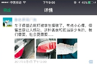 陈先生随后将被撞坏的尾灯和留言条拍了图片,发到微信朋友圈,“虽然车子停路边尾灯被学生撞破了,有点小心痛,但留言挺让人感动,这种善良和担当是少有的,我们需要,社会更需要……”