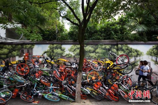 9月19日,南京碑亭巷内,各种颜色的共享单车堆放在一起,色彩交织的“叠罗汉”景象令过往的市民侧目。中新社记者 泱波 摄