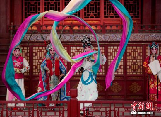 9月19日晚,北京故宫博物院畅音阁戏曲馆经过提升改造后首次开馆,出席“太和·世界古代文明保护论坛”的代表们观看了首场演出。中新社记者 杜洋 摄