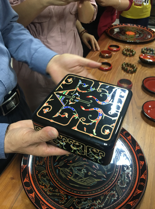 祝成超在向海外网记者展示工厂的漆器制品。摄影/庞晟