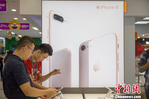 工作人员正在给民众介绍iPhone8手机新功能(资料图)。中新社记者 张云 摄