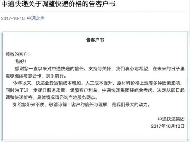 10 月 10 日晚间,中通快递官方微信 " 中通之声 " 发布了一份《告客户书》表示: