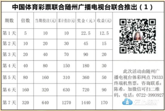 活动1:“你参与我买单”活动,7天包赔试收益,每天开放58个名额,限起步投注10元,7天计划投注,7天内若中奖,赢利属你,若不中奖包赔全额本金。活动期间每天限58个名额,每人只能体验一次。本活动参与起点第一天投注10元,第二天投注20元,未中奖以此类推,中奖回到起点投注(参见活动表1)。清河路电视台体彩79333终端网点特聘足球专家团队助力公益,每天推荐的比赛中奖奖金2.25倍左右,平均每月中奖15次左右。