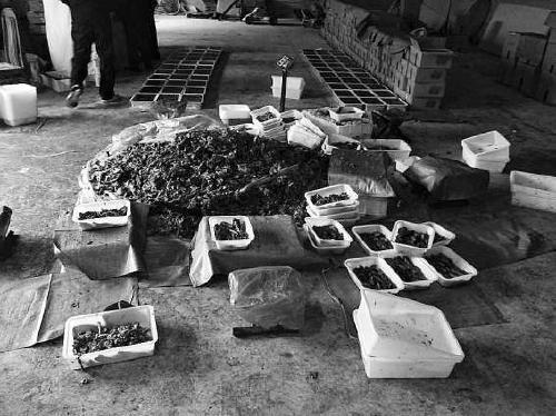从现场查获的写着送货单的4个笔记本记载内容看,“26号加工了10斤装的肉冻55箱,5斤装的肉冻5箱;27号加工了6斤装的肉冻15箱,40斤装的肉冻10箱;28号加工了6斤装的肉冻20箱,10斤装蓝胶带的肉冻27箱,20斤装的肉冻16箱……”按一般每箱两盆计算,5人每天加工肉冻一千斤左右。