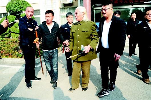 楚天都市报讯 图为:94岁老人黄云彪,在河北无极县救助站工作人员陪同下,又回湖北寻人