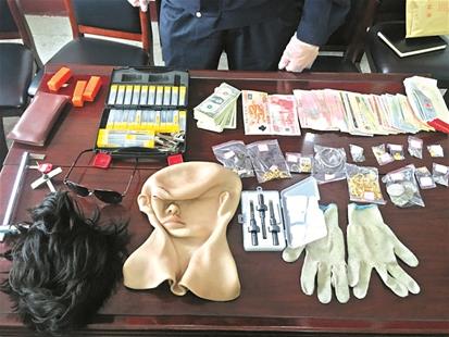 锁定二人之后,北港派出所密切追踪,一路追至黄石市。11月9日凌晨,民警在黄石将两嫌疑人张某强和张某申抓获。在他们的随身行李中,民警搜查出“人皮面具”以及假发、手套、墨镜、开锁器等作案工具,查获7000元新款人民币、100余美元,还有银元、纪念币等,以及项链、钻戒等金银首饰40余件。