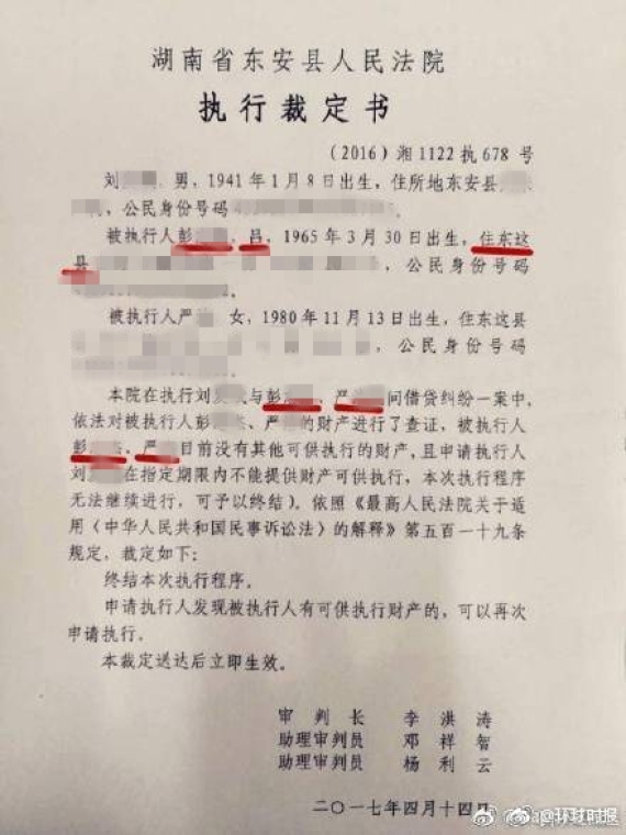 据网民曝光的照片显示,这份裁判文书是一份执行裁定书,落款时间为2017年4月14日。不过这份只有数百字的文书上,却出现了7处错误,包括两处把“东安县”写成“东这县”,把两名被执行人的名字反复写错,把性别“女”写成了“吕”,“身份证号码”写成“身份号码”等。