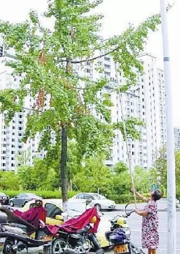 一些人会肆意敲打路边作为行道树的银杏树,然后不顾交通安全,捡拾从树上掉下来的银杏果。