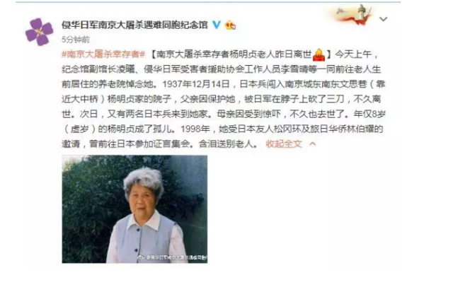 昨天,南京大屠杀幸存者佘子清、杨明贞2位老人离世
