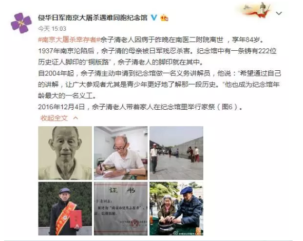 据@侵华日军南京大屠杀遇难同胞纪念馆 发布的微博: