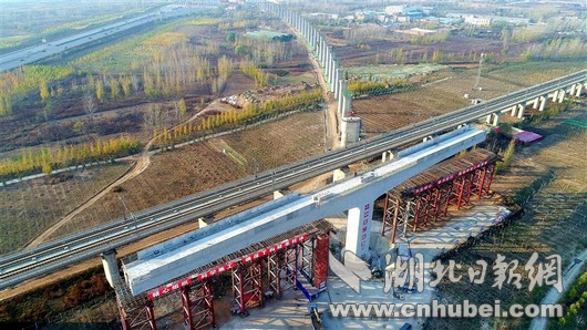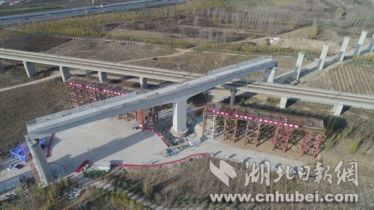湖北日报网讯(全媒体记者廖志慧、通讯员黄成伟、徐正荣、陈嘉伦)11月22日凌晨1时50分,由中交二航局承建的郑万高铁上行联络线万吨桥梁逆时针转体50度,完美跨越京广高铁,实现了国内首座万吨级曲线T型高铁桥成功转体施工。