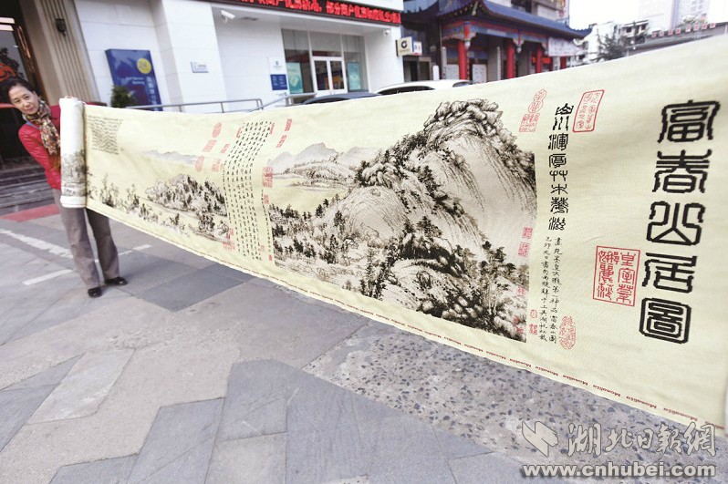 汉口63岁的安玲玲女士,用了3年零8个月的时间,绣了一幅《富春山居图》的十字绣,长15米,宽0.66米,为了方便自己和他人欣赏,她想了各种办法也无法将整卷作品拍下来,感到十分遗憾。前日,她求助《帮到底》栏目记者,希望能将这个作品拍个完整的照片,完成她的一个心愿。
