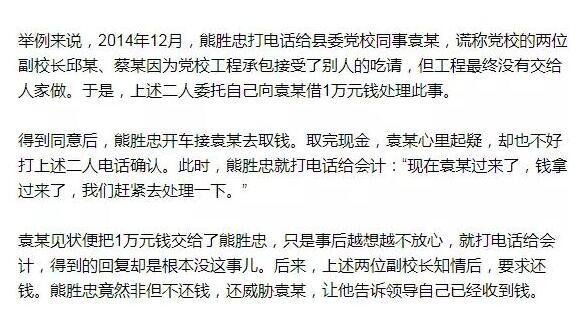 在交往过程中,熊胜忠主动透露出自己在县委党校担任工会主席,颇受器重,他还自称与县领导关系匪浅。于是曹某夫妇越来越信任他。